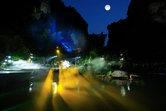 The Ancient Mystical Legend of Zhangjiajie 《武陵魂•梯瑪神歌》是一場記述土家族起源、演變、戰(zhàn)爭、生產生活等內容的大型立體山水實景演出,揉合了音樂、舞蹈、文學等多種藝術形式,如幻如夢的舞美燈光,搖曳生姿的原生態(tài)歌舞……濃縮了土家族數(shù)千年的發(fā)展歷史,400多名演員以自然淳樸的表演充分的展示了土家的民族文化特征,給游客帶來了耳目一新的感受。一場視聽的饕餮盛宴,一曲驚天地、泣鬼神的曠世古歌,給人山水文化光影視聽的享受!境銎罚簭埣医缣莠斏窀栉幕瘋鞑ビ邢薰尽
