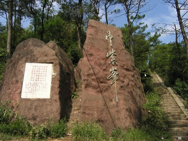 墮金石 位于金紫峰西向,兩者遙望相對(duì),近在咫尺。傳說(shuō)天上飛來(lái)一塊大金石,墮于峰尖,故名墮金石。石為花崗巖體,拙灼古樸。