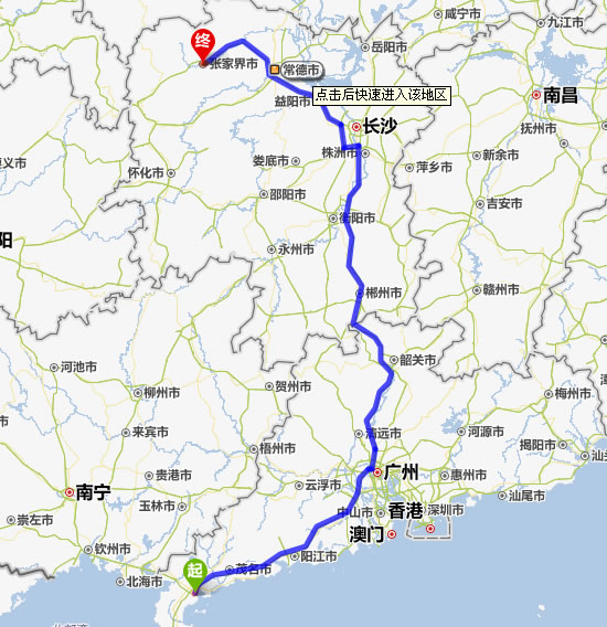 左右,沿途經過湛江——茂名——陽江市——佛山市——廣州市——清遠——英德市——韶關市——樂昌市——宜章縣——郴州市——耒陽市——衡陽市——湘潭市——寧鄉(xiāng)縣——益陽市——常德市——慈利縣——張家界。