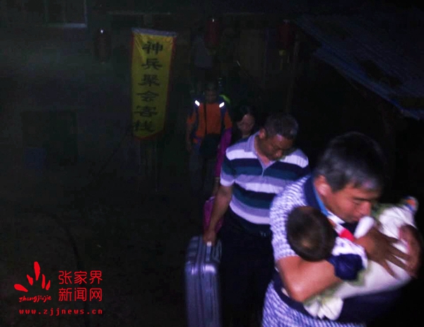 晚上9時(shí)許,由天子山景區(qū)管委會(huì)干部職工、居委會(huì)居民組成的應(yīng)急隊(duì)伍冒雨趕到老屋場,對入住游客和當(dāng)?shù)鼐用褚灰贿M(jìn)行耐心解釋,勸導(dǎo)他們連夜轉(zhuǎn)移到安全地帶。